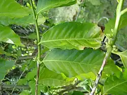 Young leaves are green, and mature leaves are generally larger than Typica leaves. Plagiotropic (secondary) branches grow at a slight angle, roughly 60° from the main (orthotropic) stem. Bourbon cherries are generally more round than Typica cherries. Bourbon accessions from Yemen tend to have a single main stem (monocauly) whereas accessions from Ethiopia tend to form multiple branches.