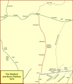 The Bourne and Sleaford Railway was promoted as a branch of the Great Northern Railway to fend off an expected incursion by the rival Great Eastern Railway. It was authorised by Parliament in 1865, but not opened until 1871 (part way) and 1872. Although agricultural traffic provided healthy business, the rural character of the line never produced much passenger trade, and it was closed to passengers in 1930. The line was severed and ceased to be a through line in 1956 and closed completely in 1965.
