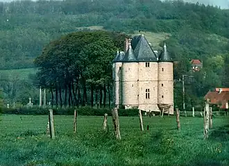 • The (restored) castle donjon, also from the eleventh century. Built of sandstone by Hugues de Bours.