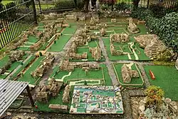 The Bourton-on-the-Water model village was one of the first to be built in England, being completed between 1936 and 1940.[1] Possibly the only earlier example is the Bekonscot model village in Beaconsfield, Buckinghamshire, which is the oldest in the world, being begun in 1929, though not finished until the later 20th century.[2][1] Bourton-on-the-Water was a fledgling tourist destination in the early 20th century and the landlord of the New Inn, Mr C A Morris, decided to build the model village to attract motorists to his public house.[3][1] Morris had originally intended to convert the pub's vegetable garden into a village green with a stream with a waterfall and scale replicas of the arch bridges in the village. He soon decided to instead construct a 1:9 scale model of the entire village.[1]