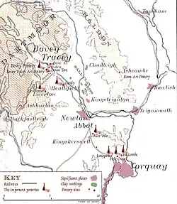 A map showing the main sites of pottery making in the area local to "Bovey Basin".