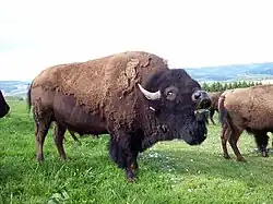Wild cattle are usually massive bovids that are stout-bodied with thick, short legs.[26][1][27][8] Some species can reach impressive body-sizes such as wild water buffalo, wild yak, American bison, and European bison, which can weigh between 700 and 1,200 kilograms and these species can attain a shoulder height more than 1.9 meters.[27] The gaur can weigh up to 1,500 kilograms and attain a shoulder height up to 2.2 meters.[5] There are some breeds of domestic cattle that can be even larger than both wild species, one of them being the Chianina, bulls of which can weigh from 1,200 to 1,500 kilograms and reach a similar height to the gaur.[28][29] There are, however, several species of buffalo that live on the various islands in Southeast Asia are dwarf species, such as the tamaraw and the anoa, that weigh between 200 and 300 kilograms.[27][8] Furthermore, not all species of bovin look like cattle, such as the saola which looks more like antelope (a fact that caused some confusion among bovid biologists[21]). What all bovins or wild cattle do have in common is both sexes have the presence of smooth horns, instead of annulated horns seen in most other bovids.[27][12][8] In bovinans the horns are round, while in bubalinans they are flattened.[26] Like the spiral-horned antelopes there is extreme sexual dimorphism in bovins, though it is emphasis on the body size and the size of the horns.[26][27][8] Males are significantly larger than the females, which most of their features are exaggerated with massive humps, large necks, and in some species the presence of a dewlap.[26][8] Males and females exhibit sexual monochromatism (with the exception of the banteng, where males are a dark chestnut while females are just chestnut), though the male coloration hues are darker than the females.[26] Coloration can be uniform or with some white markings, from black to brown.[26][8]