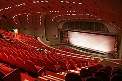 By the 1980s the theater generally resembled its current incarnation, in terms of both its facilities and its European-style interior design defined by marble floors, red carpets, and crystal chandeliers.[6] By the end of the decade, the growth of the Revue obligated the creation of a more modern and technically-efficient Grand Theater.[6] The newly-constructed theater, which opened on January 1, 1993.[5] incorporates multiple stages, dressing rooms, rehearsal rooms, offices, storage space, and the Takarazuka Music School.[13] Its exterior white stucco and red tiled roof is inspired by Spanish Colonial architecture.[13] On April 5, 2014, the centennial of the Takarazuka Revue was marked with a revue held at the Takarazuka Grand Theater.[5] The Grand Theater closed in April 2020 as a result of the COVID-19 pandemic and re-opened in July of that year, at half capacity and with recorded music instead of a live orchestra.[14]
