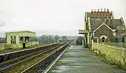 The station was originally opened by the London and South Western Railway (LSWR) in 1865.[1] The station building is a two-storey construction of Dartmoor granite with ashlar dressings and round headed windows. The platform canopy has cast iron brackets with a creeper design. There is also a single-storey waiting room and offices.[2]