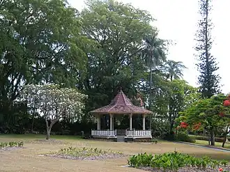 These decorative elements included a four-metre high coral-stone grotto-like ornamental fountain encrusted with shells, ferns and lichen, four pieces of neo-classical statuary (the four seasons), a gift from Joseph Oppenheimer[3] urns and various planting pots, several giant clam shells; all complemented by complex carpet bedding displays on and around a quatrefoil-shaped island within a lagoon with a bamboo grove backdrop. The dense, exuberant Victorian planting was massed in shrubberies and borders interspersed with winding paths creating a wild woodland cum exotic jungle ambience.[1]