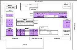 With the construction of this wing the school complex formed a U shape connected by raised walkways and verandahs around a large parade ground. The placement of the buildings organised the grade structure from infants in the west, the middle years at the south, and secondary education (the high top) in the east.[2]