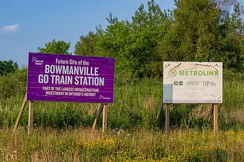 Bowmanville GO Station is a planned GO Transit train station to be built by Metrolinx in the community of Bowmanville, Ontario. It will be the terminus station of GO Transit's approved expansion of train service on the Lakeshore East line[4] and will become a transit hub for Durham Region Transit and GO Transit. According to a 2011 environmental impact assessment, the station would have about 770 parking spaces, a bus loop and a kiss and ride area on the south side of the station.[1] The station will be located on the south side of CP Rail's Belleville Subdivision and, as a terminal, it will have two stub tracks.[2]