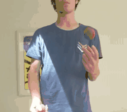 Luke's shuffle is a variation on the box in which the throws that are normally thrown horizontally are thrown diagonally downward. In this pattern, the siteswap stays the same, but the throw involves carrying the ball up over the rising 4 throw. The ball is then thrown from above the 4 diagonally downward to the opposite hand. The resulting downward throw is often known as a shuffle, giving the trick its name. This trick was invented by Luke Jugglestruck (Luke Gravett) in 1991 and shown to Charlie Dancey who included it in his book.[7]