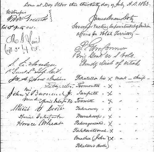 - ^ a b "Treaty made at Box Elder, Utah Territory, with the North Western Bands of Shoshone Indians, 30th July 1863" (PDF). Wikimedia Commons. 1864. Retrieved 19 July 2024.
