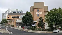 The idea of a local hospital to serve the Box Hill area first surfaced around 1937, with a 4.5-acre (1.8 ha) site in Nelson Road being acquired from the Rodgerson estate in 1945. Construction started in early 1949 but because of funding issues the hospital did not open until April 1956.[5] Its original name was the Box Hill and District Hospital.