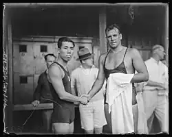 The start of 1924 in Australia was highlighted by the arrival of Swedish swimmer Arne Borg, at the time the holder of four world records, to compete against the 16-year-old Charlton in the 440yd freestyle at the New South Wales Championships. The Domain Baths were filled to capacity with between 5000 and 8000 spectators, 400m queues forming outside the venue. Borg held the lead for the first half of the race until Charlton drew level, taking the lead at the 320yd mark. Charlton eventually won by 20yds to equal Borg's world record of 5 min 11.8 s. Charlton was given a lap of honour as Borg rowed him around the pool in a small boat.[4] They again met in the 880yd and 220yd events, with Charlton winning the former in a world record time of 10 min 51.8 s and the latter in an Australian record of 2 min 23.8 s.