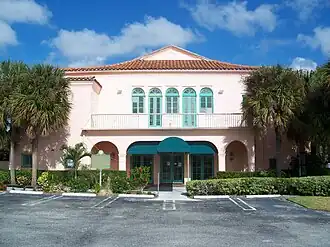 The Boynton Woman's Club is a historic woman's club in Boynton Beach, Florida. Their 1925 building, located at 1010 South Federal Highway, was designed by South Florida architect Addison Mizner and constructed as a memorial to Major Nathan Smith Boynton through a $35,000 donation from the founder's family.[2] The building provided numerous community services throughout its history. Shortly after construction finished, the building was used as a shelter for residents during the 1926 hurricane. It was also utilized by the Red Cross as a USO center throughout World War II for dances and fundraisers. In the 1950s, the Boynton Woman's Club also initiated the first full-service public library in Boynton Beach, though African American residents were not allowed in the Woman's Club during this time.[3] In 1961, the city purchased a residential building at 116 S. Seacrest Boulevard to serve as the municipal library, officially moving the collections out of the Woman's Club building.