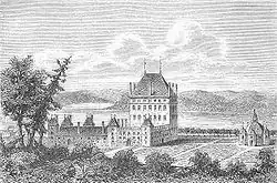 The old estate with remains of the renaissance castle covers an area of 240 by 190 metres (790 ft × 620 ft). The foundations and cellars are still visible today, together with the moats and parts of the gardens.