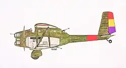 The spar of the lower wing was continuous and formed the main support of the whole structure. This spar directly attached via by steel brackets to various other elements, including steel triangular fuselage supports, tubular steel undercarriage fittings, strut fittings, and the duralumin engine bearers.[10] The undercarriage was equipped with oleopneumatic shock absorbers while brakes were present to help slow the aircraft during landings.[11] The tail boom, which had a similar structure to that of the lower wing, was attached to the fuselage using four bolts. Both the elevator and rudder were equipped with balancing flaps and were actuated using relatively rigid controls.[12]