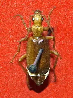 The species fly from May to June. The lifecycle is not known but the larvae are thought to be external parasites that feed on the pupae of other beetle species including Amara convexiuscula and a staphylinid beetle, Tasgius ater (Gravenhorst, 1802).[3]