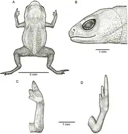 It is 8.3 to 10.4 millimeters long, with the head accounting for 34% of the size. The snout is small and almost as long as the eye, appearing rounded when viewed ventrally and laterally. The nostrils are protuberant and directed anteroventrally, the canthus rostralis is not noticeable, and the lips are close to the sigmoid. The loreal region is slightly concave and the eyes are protuberant. The tympanic membrane is imperceptible. Its tongue is as large as its body and the posterior part is not attached to the lower part of the mouth, and the choana is relatively small and rounded. Its limbs are relatively thin, with the upper limbs larger than the lower limbs. Its body is smooth, due to the lack of osteoderms, with the exception of the lateral and ventral thighs, which have small, circular or oval glands. From an osteological point of view, it is quite similar to other individuals of the genus.[2] It has fewer fingers than other species.[6]