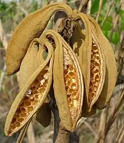 The orange-red flowers appear from June to October or sometimes November. The yellow-brown woody follicles, or seedpods, mature from September to June. Measuring 6.5–11 cm (2.6–4.3 in) long and 3–4.8 cm (1.2–1.9 in) wide, they split along their length to reveal 25–45 seeds. The seeds, which are ovoid with a smooth surface, and 8–9 mm (0.31–0.35 in) long by 6–7 mm (0.24–0.28 in) wide, are covered by a hairy coating known as the exotesta.[3]