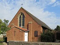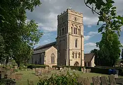 The oldest part of the Church of England parish church of Saint Peter at the eastern end of the town centre is an 11th-century Norman south doorway.[15] Both the four-bay arcade of the south aisle[16] and the west tower with its niches containing seated statues[15] were added in the 13th century. Next the chancel was rebuilt, probably late in the 13th century.[16] The north arcade and the windows in both the north and south aisles were probably added early in the 14th century, about the same time as the Decorated Gothic chapel was added to the chancel.[16]