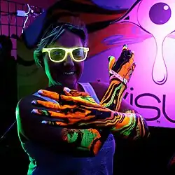 Brad Lawrence is the founder of the psychedelic art company Black Light Visuals. In 2011, Lawrence graduated from College for Creative Studies in Detroit with a Bachelor of Fine Arts degree.[1] In college, Lawrence specialized in hyperrealism charcoal drawings, but when he developed tendonitis he switched to hydro-dipping.[2] He later developed an apparel and body marbling company, Black Light Visuals.
