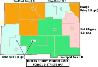 The district encompasses approximately 250 square miles (650 km2). It serves the City of Bradford, Borough of Lewis Run and Bradford Township, Corydon Township, Foster Township and Lafayette Township in McKean County, Pennsylvania.