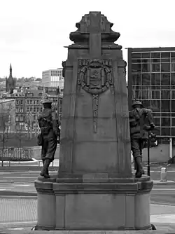 Bradford War Memorial commemorates the 37,000 men the English city of Bradford who served in the British Armed Forces in the First World War. Many of the 5,000 dead had served in the two Bradford Pals battalions and were killed on 1 July 1916, the first day of the First Battle of the Somme. The stone pylon with bronze statues was unveiled on 1 July 1922, in Victoria Square, beside Prince's Way, to the northeast of the Grade II listed Queen Victoria Memorial. A bronze plaque was added after the Second World War, and the memorial also commemorates later conflicts. It stands between the National Media Museum and Alhambra Theatre, Bradford, and was Grade II listed in 2016.
