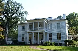 The Bragg House is a historic house in rural Ouachita County, Arkansas. It is a two-story Greek Revival house located about 4 miles (6.4 km) west of Camden, the county seat, on United States Route 278 (formerly designated Arkansas Highway 4). The house is basically rectangular in plan, with a hip roof. Its main entrance is sheltered by a two-story temple-style portico, with four columns topped with Doric capitals, and a turned-baluster railing on the second floor. Peter Newport Bragg began construction of the house in 1842, but did not complete it until 1850. The house was built out of virgin lumber sawn on Bragg's sawmill by his slaves; it remains in the hands of Bragg's descendants.[2]