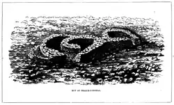 "Upon reaching the fortified British post of Braich y Dinas, on the summit of Penmaen Mawr, we found the circuits of stone walls still perfect in some parts, but greatly dilapidated in others. They are about 12 to 15 feet height, and about 12 feet thick; of loose stones, not fitting into each other with any attempt at masonry, but merely the shattered debris of that rough mountain piled together by human art. There is no appearance of mortar, nor of vitrification. Between the walls, and inside the central inclosure, but especially on the north eastern side of the summit, are a vast number of small circular cells, or cyttiau, which no doubt served for the habitations of the persons occupying this fortified post, and similar to those so common on the Caernarvonshire hills. Some of them were singularly perfect, and one, near the present north western entrance to the fortress, is still covered with its roof, but we could not penetrate within, and we did not feel ourselves justified in attempting to remove the stones."[9]