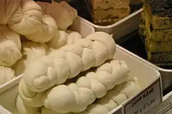 Braided cheese is a dairy product made from strips of highly elastic cheese wound together in a braid.[1] Lebanon, Syria, Sudan, Turkey, Armenia, Palestine, and many Latin American nations make varieties of braided cheese. These cheeses can be used in a variety of dishes or eaten plain. Some varieties benefit from a soak in cold water, to soften the cheese, and to remove excess salt.[2]