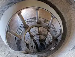 The Bramante Staircase features granite Doric columns and a herringbone paving pattern, and was designed to allow people and pack animals to ascend and descend without interruption.[1] The stair is cited as the inspiration for Antonio da Sangallo the Younger's design for the double helix passageway at the well of San Patrizio in Orvieto, to solve a similar logistical problem. The staircase was built to allow Pope Julius II to enter his private residence while still in his carriage, since walking up the several flights in heavy papal vestments would have been onerous.