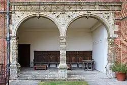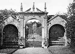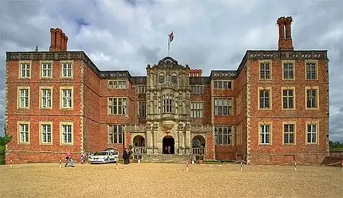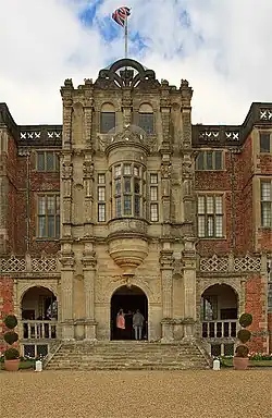 The north façade has three bays separated by windows and features a loggia, typical of early 17th-century houses, with a central arched entrance to accommodate coaches.[42] The central bay is crowned by an ornamental pierced parapet below a niched Dutch gable, which shelters a small statue of Lord Zouche[42][45] or James I.[46] There are small obelisks at either side of the gable.[28] Thorpe originally intended the main entrance of the house to be on this side, building on the gatehouse of the earlier Foxley house.[47]