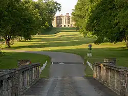 The main avenue approaches from the southwest, through an arched gateway formed by two Grade II listed early 19th-century lodges,[88] before crossing the Broad Water formed by the River Hart by a Grade I listed early 19th-century bridge with two arches.[89] There are separate listings for other structures near the house, including the Grade I listed early 17th-century triple-arched gateway on the route to Reading to the northeast of the house,[90] Grade I listed early 17th-century boundary walls and turrets to the south and west,[91] Grade II listed boundary walls and gate-piers to the west, including the kitchen garden,[92] Grade I listed garden walls and gateways to the north and east,[93] and the Grade II listed late 18th-century stable block to the north.[94]