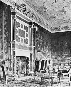 The massive chimneypiece in the drawing room is classically designed, believed to be inspired by one of the great Italian architects of 16th-century Mannerism, Giacomo Barozzi da Vignola.[65] It is two storeys in height, the lower being Doric and the upper Ionic. The distribution of the members is regular, and the shafts of the columns are variegated marble. The upper compartment of the chimneypiece is composed of separate pieces of the same diversified material, and the frieze of the upper order also consists of coloured marble in the centre. The fireplace is 6 feet (1.8 m) wide and 4 feet 8 inches (1.42 m) high, and retains the ancient andirons, used for burning wood. These are large and well adorned, particularly in the lower part.[65]