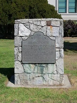 The present day Branciforte Small Schools Campus (BSSC) building is located at what was the center of the Villa de Branciforte. A California State historical marker, number 469, is located outside of the building, too, at the corner of Water Street and Branciforte Avenue.[3]