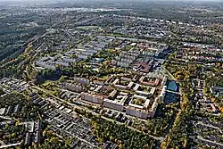 Most of the buildings are dense apartment blocks that were built during the 1960s and 1970s. Some of the nearby amenities include supermarkets, restaurants, a post office, a shopping center, and Tyresta National Park.[1] The commute to central Stockholm is generally facilitated via bus and commuter rail services, with options for walking, biking, and driving.