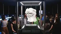 On a 71 m2 (764 sq ft) large panoramic screen which covered three walls of the room the museum showed a visual history presentation without language barriers. A 38 channel surround system provided a supporting 3D sound experience. The show took 20 minutes to illustrate Berlin, German and world history based on the Brandenburg Gate.[4] The supporting exhibition deepened the historical facts and showed a faithful replica of the head of Nike, the Brandenburg Gate Quadriga charioteer and goddess of victory.