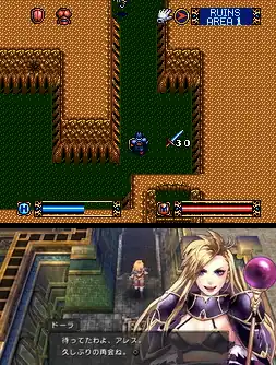 One day, a swordsman named Ares is pursued by his nemesis, the sorceress Dela Delon who seeks revenge for his slaying of her master.[4] When Dela catches up with Ares and attacks, her magic causes the ground beneath them to collapse and both fall into the cursed Ruins of Vittoria. The player assumes the role of Ares and must escape from the dangerous ruin, with the vengeful Dela constantly in pursuit of him. She is also interested in escaping the maze herself and the two meet repeatedly. The ending changes slightly depending on whether or not Ares helps her out of danger during certain events late in the game.
