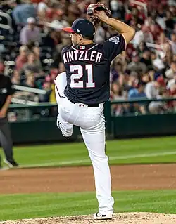 On July 31, 2017, the Twins traded Kintzler to the Washington Nationals in exchange for minor league pitcher Tyler J. Watson.[43] Kintzler served as the club's seventh-inning reliever, setting up for Ryan Madson and Sean Doolittle in the eighth and ninth, respectively.[44] In the remainder of the regular season, Kintzler recorded only one save but posted a 3.46 ERA in 26 innings with the Nationals.[45] Kintzler made three appearances in the 2017 National League Division Series (NLDS). He gave up one run in each of his last two outings, and was credited with the Game 3 loss to the Chicago Cubs.[46] The Cubs ultimately won the series 3–2, eliminating the Nationals from the playoffs.[47]
