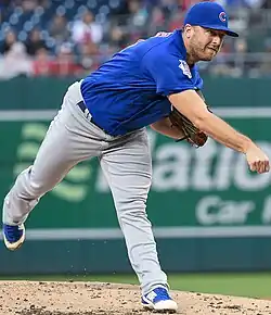 After acquiring Kintzler from the Nationals, Cubs manager Joe Maddon praised the pitcher, calling him a "very durable kind of guy [...] Good sink. Puts the ball on the ground."[54] Kintzler struggled with the Cubs in 2018, allowing 14 runs and posting a 7.00 ERA in 18 innings.[55] He admitted that his struggles were largely mental, telling NBC Sports Chicago that, "I feel like when I came over, I tried to be perfect. And usually I'm more of a guy that is in full-on attack mode."[56] Between the Nationals and the Cubs, Kintzler finished 2018 with a 3–3 record, 4.60 ERA, and 43 strikeouts in 70 games and 60+2⁄3 innings.[24]