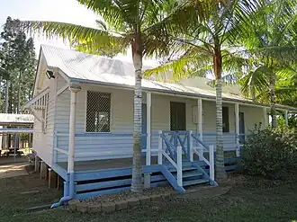 The teaching building, comprising two buildings of the same standard design by the Queensland Department of Public Works, is important in demonstrating the principal characteristics of Queensland provisional school buildings. The conjoined buildings retain their lowset form; narrow width; original verandah slope, with the front verandah stepped in from the gable bargeboards; exposed roof trusses; and louvered gable ventilation.[1]