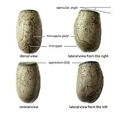 As with all Obrimini, the 4 to 5 millimetres (0.16 to 0.20 in) long and 2 to 3 millimetres (0.079 to 0.118 in) wide eggs are laid in the ground using the laying spine (ovipositor) at the end of the abdomen. The eggshells are gray and become darker when the humidity is higher, becoming lighter again when it is dry. The dorsal area is bulging and the lid (operculum), which is always dark gray in color, sits on the egg sloping towards the ventral side, so that an opercular angle of around ten degrees is created. The nymphs hatch from the eggs after about four months and then need another four months to grow.[4]