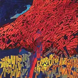 Bonifacho's earliest work dating from 1959-1963 was the politically motivated and intensely emotional "Eyes over Belgrade" series. He used roof tops and the exterior surfaces of buildings as massive canvases where he painted target-like pop designs critiquing war and the US and Russian space race while engendering ire in his neighbours.[3] Even though Yugoslavia had pulled out of the Warsaw Pact in 1948 and Belgrade was as artistically progressive as London[4] (for example, noted New York-based performance and fellow Serbian-born artist Marina Abramović was a member of Bonifacho's social and artistic milieu), it was under the rule of president-for-life, Josip Broz Tito. The themes of war, nuclear holocausts, environmental devastation, and human vulnerability have dominated much of Bonifacho's work, as noted in an article by social activist and author Christian Parenti in his comments about Bonifacho's 25-year retrospective show at Belgrade's Progress Gallery (Galerija Progres) in 2000.[5]