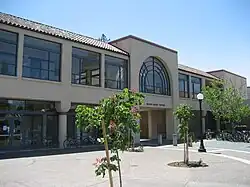 The long, stucco-faced, 2-story building occupies a critical place on Stanford's campus, bisecting "The Row" (a residential portion of campus) and White Plaza.[9] The building's main architectural feature is its long open-air arcade that the street Lausen Mall passes through, allowing students to easily traverse between the popular residential and social hubs on the University. The Braun Center preserves traditional Stanford architectural styles, boasting bright glass arches and red-tiled columns.[1]
