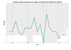Bray Unknowns joined the League of Ireland in 1924–25, replacing Midland Athletic. Together with Fordsons, they became the second and third teams, after Athlone Town, from outside of County Dublin to join the league. During their time in the league, Bray Unknowns regularly finished in the bottom two. On 28 October 1928 Bray Unknowns lost 11–0 to Shamrock Rovers. This still remains Rovers record win. Bray Unknowns best performance in the league was a fourth-placed finish in 1936–37. They were FAI Cup semi-finalists in 1924–25, 1925–26 and 1939–40. At the end of the 1942–43 seasons Bray Unknowns failed to get re-elected.[4][5][6][7]