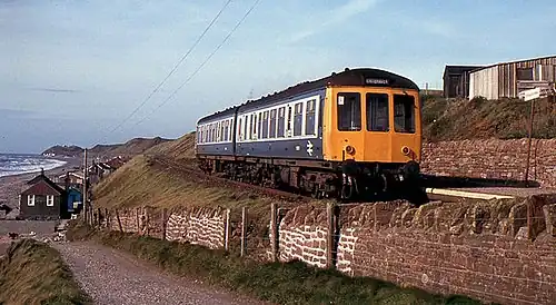 The Whitehaven and Furness Junction Railway was authorised in 1847 for a line which would link the town of Whitehaven with the Furness Railway at Broughton-in-Furness.[2] It was opened in stages, and the first section, that between Whitehaven and Ravenglass opened either on 1 June 1849[3] or on 21 July 1849.[4] The station was host to four LMS caravans from 1937 to 1939.[5]