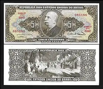 ![]() Example of a Cr$5 note of 1963 of the 2nd print, portraying the bust of Barão do Rio Branco on the obverse | |