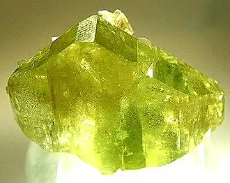 Brazilianite is a mineral in the monoclinic system that is part of the point group 2/m and belongs to the space group P21/n.[9] The crystals of brazilianite are elongated and prismatic along [100].[10] Most common forms that are measured in brazilianite {010}, {110}, { 111}.[11] It displays a perfect cleavage on (010), it is brittle and has a conchoidal fracture.[7] The mineral has a Mohs hardness of 5.5 and was believed it had a specific gravity of 2.94 which was first determined by Pough and Henderson, 1945. With the second occurrence of the mineral, it was determined that the specific gravity of the mineral was actually 2.98.[10] Brazilianite has a vitreous luster, has a white streak, and the mineral is translucent to transparent.[7] The color of brazilianite ranges from dark yellow-green to a pale yellow.[6] Brazilianite begins to lose its color when heated to 200 °C and becomes colorless when it is heated to 300 °C.[11]