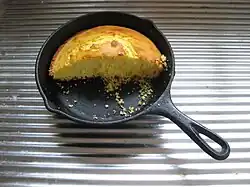 Cornbread is made from cornmeal and can differ significantly in taste and texture from region to region. In general, the South prefers white cornmeal with little to no wheat flour or sweeteners added; it is traditionally baked in a cast-iron skillet and ideally has a crunchy outside and moist inside. The North usually prefers yellow cornmeal with sometimes as much as half wheat flour in its composition, as well as sugar, honey, or maple syrup. This results in a bread that is softer and sweeter than its southern counterpart. Wheat flour was not available to the average North American family until the early 1900s when a new breed of wheat termed Marquis was produced. This was a hybrid of Red Fife and Hard red winter wheat. Marquis grew well and soon average Americans were able to have homemade wheat bread on the table.[26] Homemade wheat breads are made in a rectangular tin similar to those in the United Kingdom.