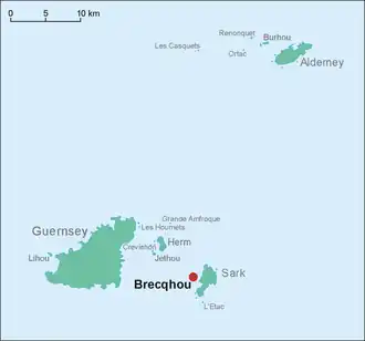 Brecqhou (or Brechou; French pronunciation: [bʁɛku]) is one of the Channel Islands, located off the west coast of Sark where they are now geographically detached from each other. Brecqhou is politically part of both Sark and the Bailiwick of Guernsey. It has been established in the courts that Brecqhou is a tenement of Sark. The Ministry of Justice, the department of the United Kingdom government with responsibility for the Channel Islands,[2] considers Brecqhou part of Sark.[3]