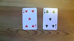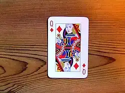 The Jokers are removed from a standard 52-card Danish pattern pack. Aces are high, 2s are low. The highest card is the trump Ace. The Queen of Hearts cannot be beaten, only passed on or picked up.