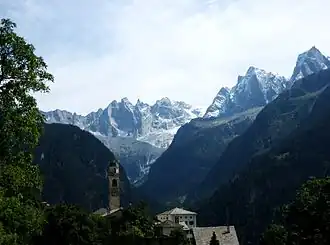 The church of S. Maria in Castelmur was largely rebuilt in the 19th century, but still has its Romanesque campanile.[14] S. Maria in Bondo also has a Romanesque bell tower. This church was restored in the 17th century but retains an important late 15th-century fresco cycle. The remains of the painter Varlin are interred in the nearby cemetery.[15][3] Further notable buildings include the Casa Molinari, the Palazzo Scartazzini of 1690, the Palazzo Scartazzini am Platz (formerly Cortini) of 1763 and the Palazzo Salis;[3] this last was begun by Jerome de Salis-Soglio in 1765 for his wife Mary and completed by their son in 1774. There is also a group of crotti towards Promontagno.[3] In the twentieth century the painter Varlin captured much of the spirit of the village.
